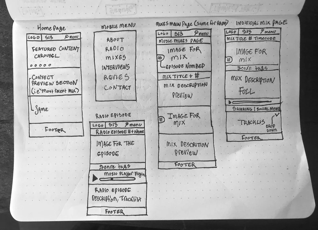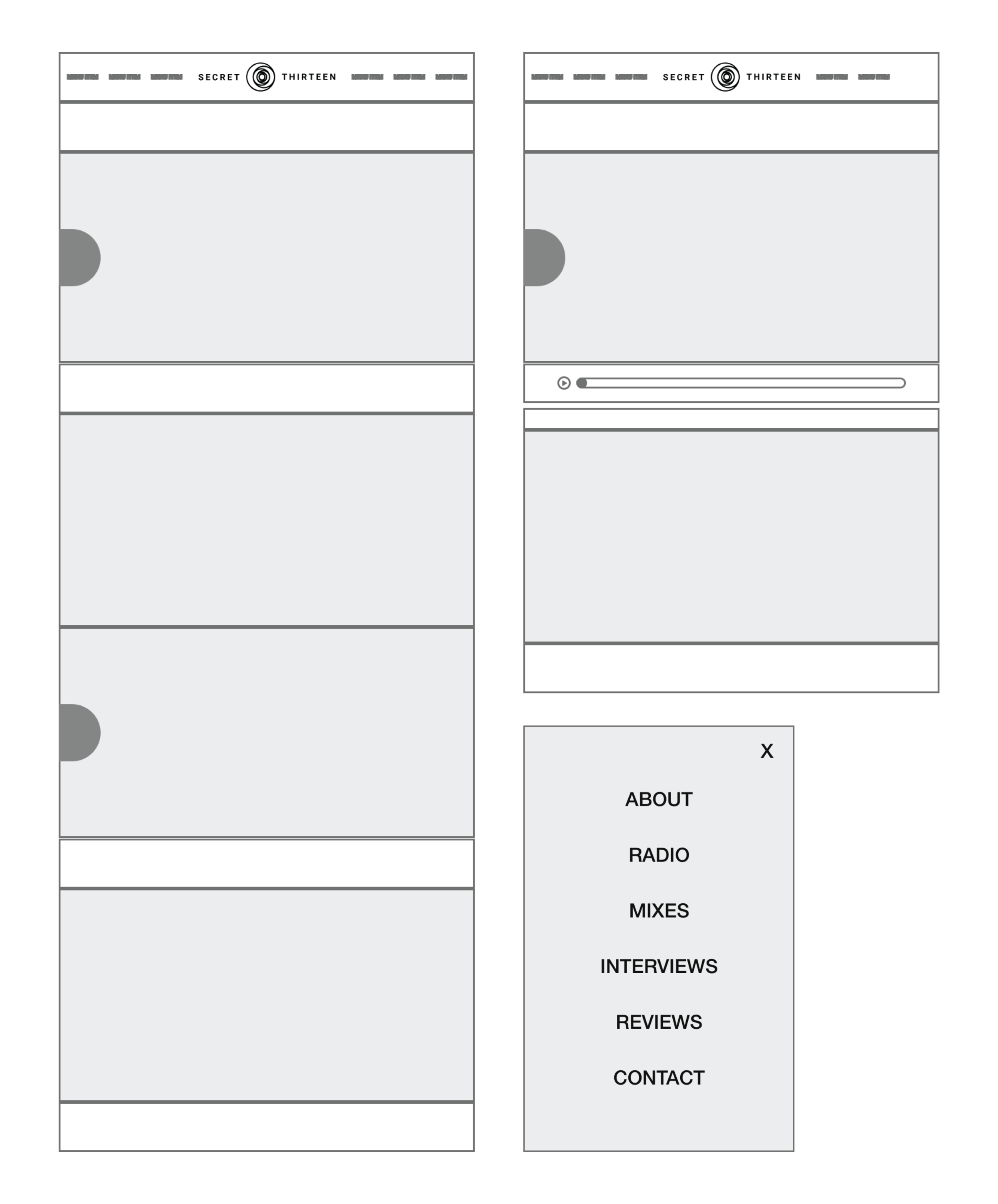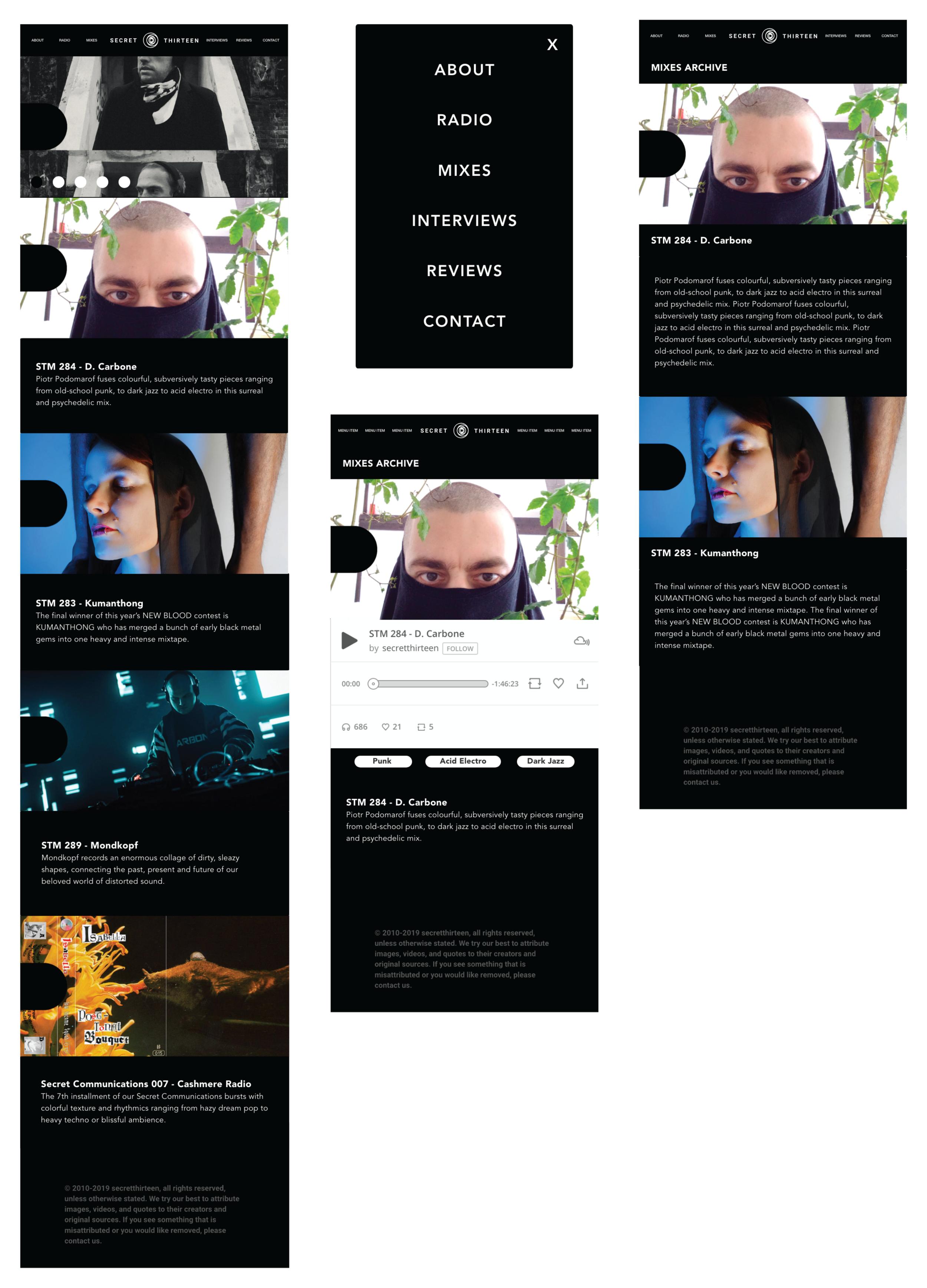 I incorporated the results of all my research findings, and expanded the low-fidelity designs into fleshed out designs for the Secret 13 homepage, mobile menu, mixes archive, and page for an individual mix.